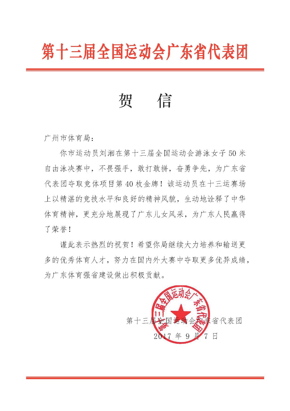 我市运动员刘湘在第十三届全国运动会游泳女子50 米自由泳决赛中,不畏强手,敢打敢拼,奋勇争先,为广东省代表团夺取竞体项目第40 枚金牌!